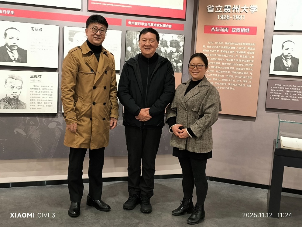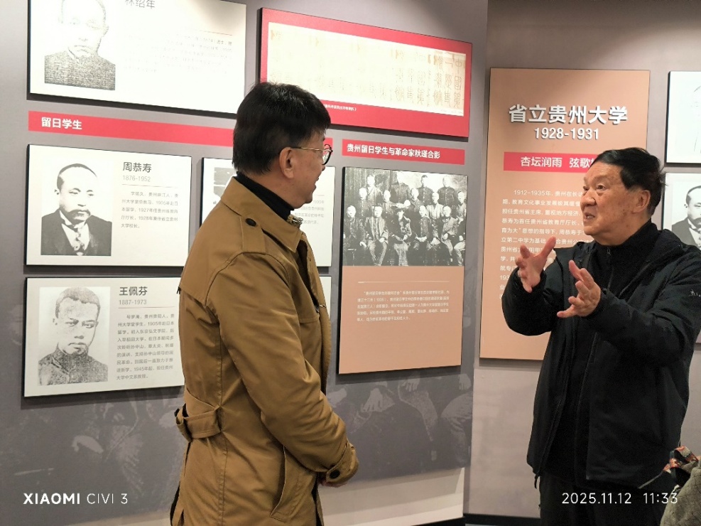 2025年11月12日,贵州大学原副校长、1960级校友张世俊在档案馆(校史馆)馆长周永兴的陪同下参观校史馆,并向档案馆提供重要历史资料。