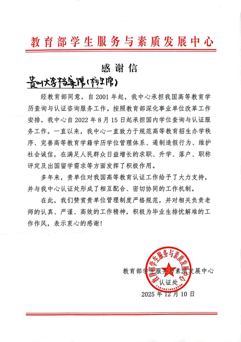 2025年12月10日,教育部学生服务与素质发展中心向贵州大学档案馆(校史馆)发来感谢信。信中,对档案馆构建的规范管理、紧密协同工作机制给予了高度评价与充分肯定,尤其对馆内工作人员展现出的认真负责、严谨细致、高效务实的工作精神,以及全心全意为毕业生排忧解难、热情服务的工作作风表达了诚挚谢意!