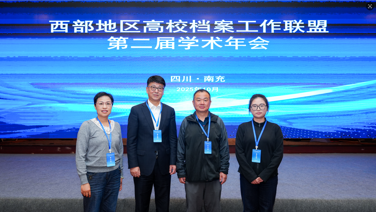 2025年10月22日至25日,西部地区高校档案工作联盟第二届学术年会在四川南充召开。本次大会以“使命与创新:激发档案新质生产力,赋能西部高校高质量发展”为主题,汇聚西部13个省区市94所高校的240余名档案工作者。我馆馆长周永兴、副馆长丁超、郑贤莉、吴彦等一行四人参会。